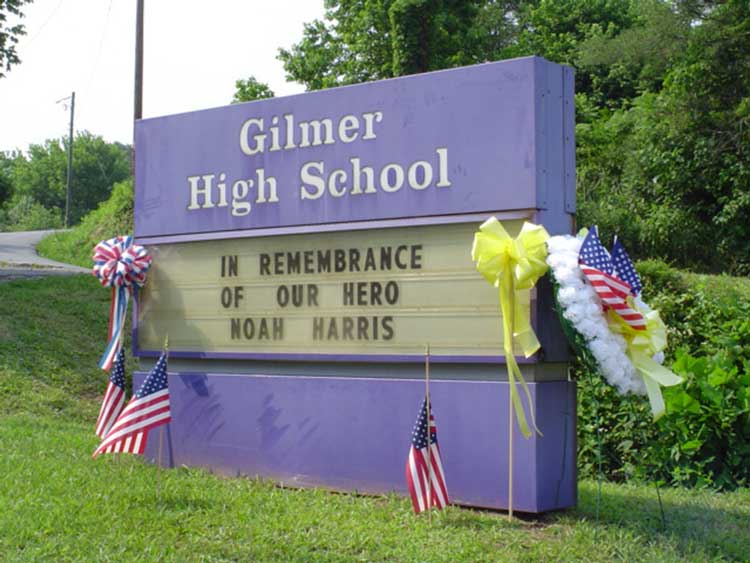 Gilmer High School paid tribute to the fallen former GHS standout, 1st Lt. Noah Harris, by retiring his number 27 football jersey during a pre-game ceremony, Aug. 26, at Huff-Mosley Memorial Stadium... Head football coach Rob Stowe presented the jersey to the parents of Harris.... In addition to retiring his jersey, the Gilmer Touchdown Club sold T-shirts (lovingly designed by Lisa Bradley and her mother-in-law) honoring Harris, with the proceeds from the sales going to the Noah Harris Memorial Fund. The T-shirts were printed by Team Sales of North Georgia, Inc., in Jasper Ga.,... with a picture of Harris in his football uniform, and one of him in his desert Battle Dress Uniform on the front with the words “From a Gilmer Bobcat...To An American Hero, In Loving Memory of 1st Lt. Noah Harris, KIA 06-18-05,” on the front, and his name and number 27 on the reverse side, sold during the game.