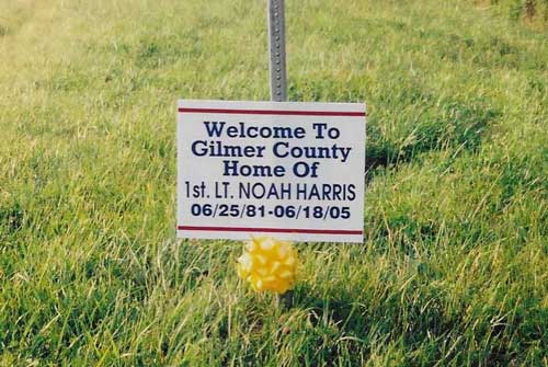 I will never forget the police escort to town. In my experience, it was so surreal because the police were leading instead of following me. Lucy and Ashley burst into tears of pride as we rolled by mile after mile of yellow ribbons, flags waving, and a sign that broadcast, WELCOME TO Gilmer County, Home of 1st Lt. Noah Harris. When we got to town, I had a hard time driving because it was just so amazing. Every possible spot in view was filled with a waving Old Glory or a yellow ribbon. They were everywhere!
