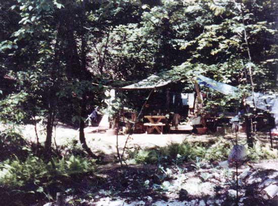 I had built us a tent-like shelter under a huge maple tree with a babbling creek rolling all the way around us from 9 o’clock to 6 o’clock. The shelter was large enough so we had a double bed mattress on a plywood platform with lots of storage underneath. On the other side of the shelter, at the foot of the bed, was our picnic table complete with a two-burner Coleman stove. The shelter had no sides because we liked being outside, but when it did rain, there were clear plastic panels attached to the roof that we could pull down. Most of the time, these panels were up and at night we could watch the moon from our bed. We lived outside for 6 months in this early phase of building so we had to learn how to wash and bathe in the creek. Later when we counted back, we figured out that Noah actually was a “nature” child conceived under that maple tree.