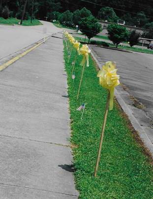 Most of the ribbon is down now, but the message of it still goes on. There are teachers who are teaching Noah’s philosophy, the theater students and football players dedicated every play to him in 2005—it was marvelous being hugged by 65 guys who had just warmed up for a game. Go Bobcats! FCCLA teacher Carol Watkins arranged about half of the student body into a giant yellow ribbon which she photographed and sent to Noah’s men. Six-year-old Jay Stowe whose daddy is a Georgia Bulldog and one of Noah’s football coaches told us at a Friday night football game in clear terms that he was writing a book about Noah’s life and that, for dress-up day, he was going to be a hero, he was going to be number 27 (He presented us with the book on Veteran’s Day, 2005, and we hope someday to share it with primary and elementary school kids.) A center page spread in the GHS Band football program was dedicated to our hero. Jodi Bramlett and her mom, Susan have vowed "...to pay our respects every year..." by placing American flags where we can see them in honor of Noah's birthday.