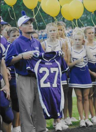 Gilmer High School paid tribute to the fallen former GHS standout, 1st Lt. Noah Harris, by retiring his number 27 football jersey during a pre-game ceremony, Aug. 26, at Huff-Mosley Memorial Stadium... Head football coach Rob Stowe presented the jersey to the parents of Harris.... In addition to retiring his jersey, the Gilmer Touchdown Club sold T-shirts (lovingly designed by Lisa Bradley and her mother-in-law) honoring Harris, with the proceeds from the sales going to the Noah Harris Memorial Fund. The T-shirts were printed by Team Sales of North Georgia, Inc., in Jasper Ga.,... with a picture of Harris in his football uniform, and one of him in his desert Battle Dress Uniform on the front with the words “From a Gilmer Bobcat...To An American Hero, In Loving Memory of 1st Lt. Noah Harris, KIA 06-18-05,” on the front, and his name and number 27 on the reverse side, sold during the game.